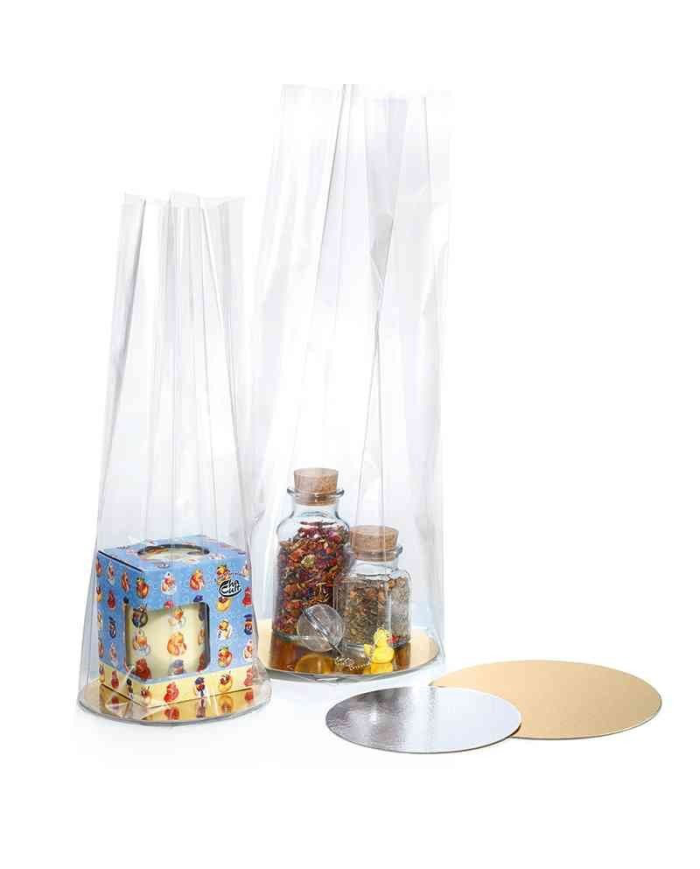 Diamond bags are sturdy transparent bags with an extra wide side pleat. The pockets are high, which makes it possible to pack bottles of wine in these diamond bags, for example. This type of side gusset bags are often used to make gift packaging for fruit, flower arrangements, large chocolate figurines, etc. Excellent product for fast and stylish packaging of gift sets.