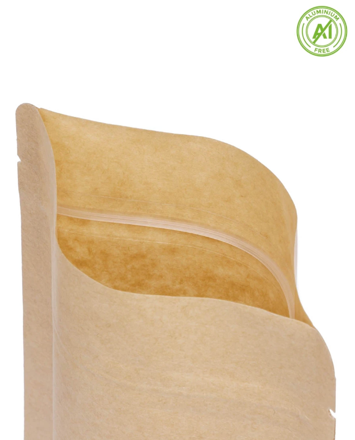 Cost-effective and high-quality standing doypack bag made of unbleached Japanese kraft paper with an inner layer of PE and PET film, which combines functionality with a natural appearance. This packaging offers good protection against moisture and oxygen, a practical ZIP closure and easy opening, making it ideal for packaging lighter food and non-food products.