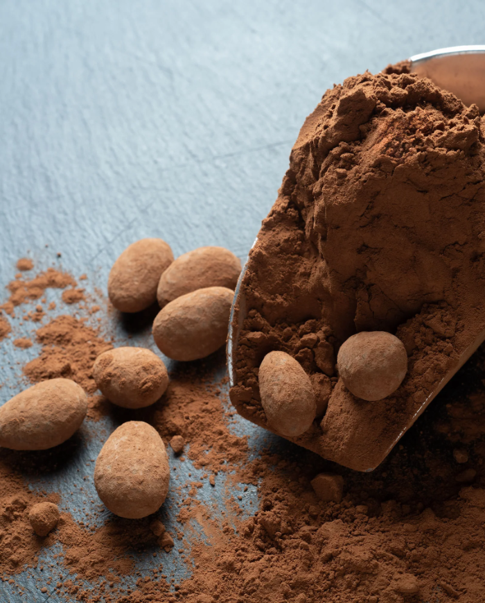 Lahodné pražené lieskové orechy z Piemontu, obalené 45 % mliečnou čokoládou s kakaovým práškom a lahodné mandle z Valencie obalené 75 % tmavou čokoládou z Madagaskaru, tiež obalené kakaom.