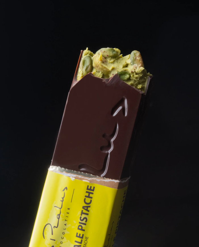 Infernale Bars, charakteristické dielo Françoisa Pralusa, kombinuje potešenie z čokolády s chrumkavou a topiacou sa textúrou, čím vytvára dokonalú zmes chutí okolo vynikajúcej čokolády. Pod tmavou čokoládovou polevou sa skrýva jemné a ľahké pistáciové pralinové srdce posypané iránskymi pistáciami.